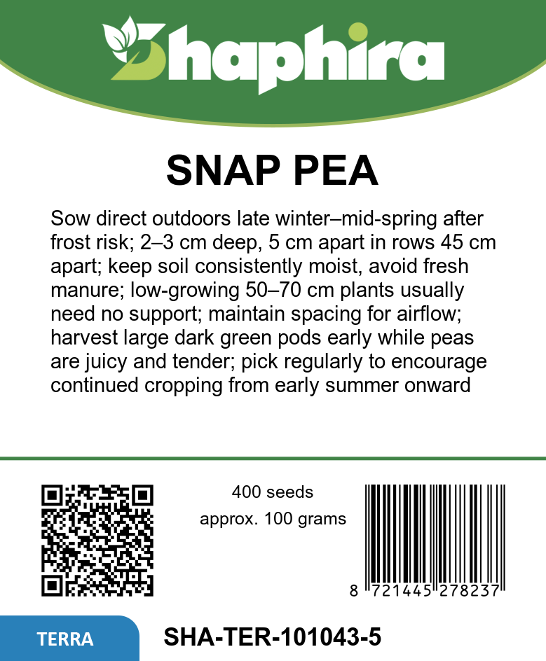 Maintain consistently moist soil to support vigorous growth of these low-growing snap peas, avoiding fresh manure to prevent diseases. Space rows about 45 cm apart and keep plants approximately 5 cm apart within rows for optimal airflow and nutrient access. Their compact habit means no climbing support is needed, making care easier. Harvest pods early while peas are juicy and tender to enjoy their sweet flavor, as delayed picking may lead to a mealy texture. Regular harvesting encourages continued production, ensuring a bountiful and flavorful yield throughout the season.