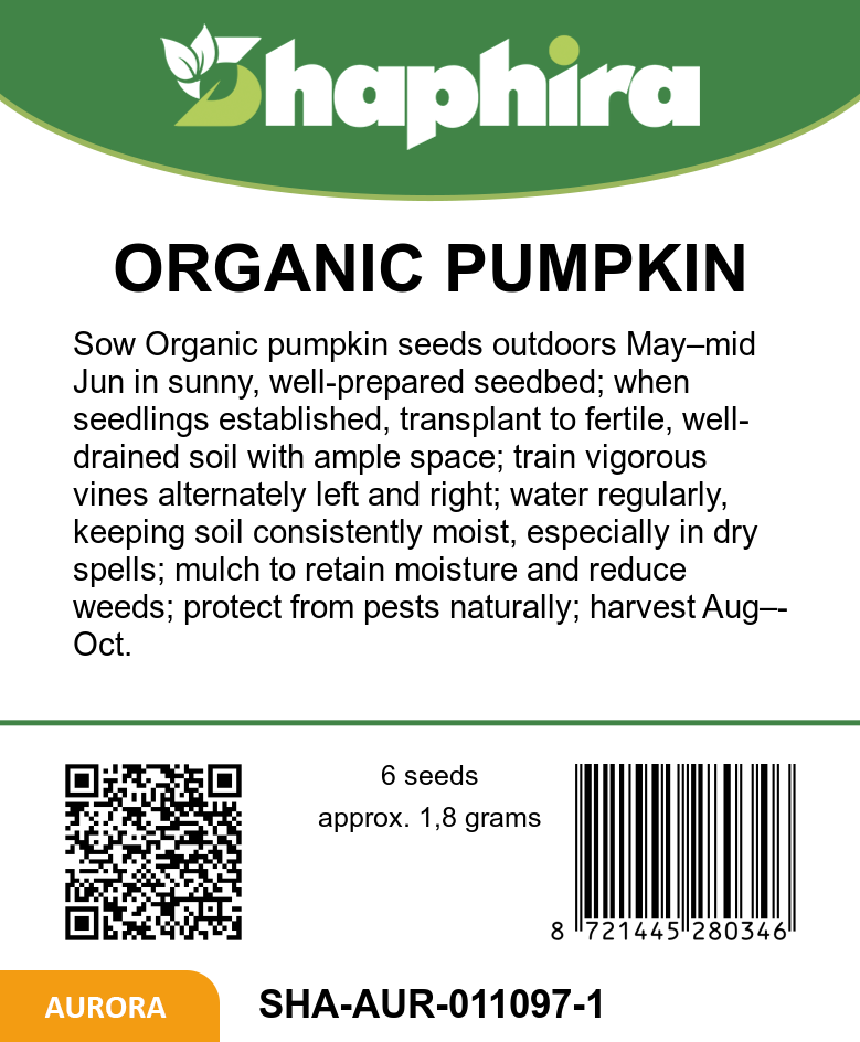 Sow the organic pumpkin seeds outdoors from May to mid-June in a well-prepared seedbed. Once seedlings are established, transplant them into fertile, well-drained soil with ample space for growth. Train the vigorous vines alternately to the left and right to promote healthy development and maximize yield. Regular watering is essential to support the plants during establishment. Choose a sunny location to ensure vibrant growth. These seeds are suitable for outdoor cultivation and will produce striking pumpkins ready for harvest from August through October.
