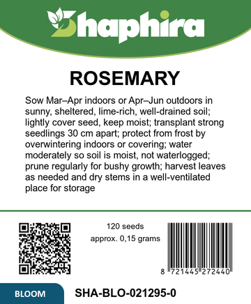 These hardy rosemary shrub seeds fit beautifully into Mediterranean herb garden seeds collections, edging an outdoor path, or as rosemary seeds for herb gardens near the kitchen door. The plants respond well to light pruning, helping you maintain a bushy, productive shrub for harvesting from June through September. Rosemary seeds for containers are particularly suitable for patios, balconies, and small spaces, where pots can be placed in a warm, sunny, and sheltered spot. Use the aromatic stems and leaves sparingly in meat and fish dishes, with lamb, beans, broths, soups, and stews, or as a flavorful accent for grilling and barbecues.