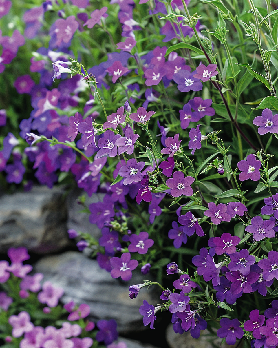 This variety produces abundant sapphire blue flowers that trail beautifully, reaching about 30 cm in height. It blooms from June through September and thrives in sunny to partly shaded locations, making it perfect for hanging baskets, flower boxes, and rock gardens.