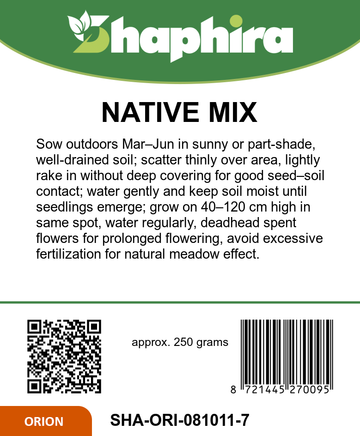 This native flower mix thrives in sunny or partially shaded locations, reaching heights between 40 and 120 cm. Regular watering helps maintain vibrant blooms throughout the season. Deadheading spent flowers encourages prolonged flowering, while avoiding excessive fertilization preserves the natural balance. The diverse annual varieties attract bees and butterflies, supporting local pollinators and biodiversity. Suitable for creating a colorful, natural meadow effect, this mix enriches your garden ecosystem with minimal care, making it an excellent choice for enhancing outdoor spaces with sustainable, ecological beauty from May to October.