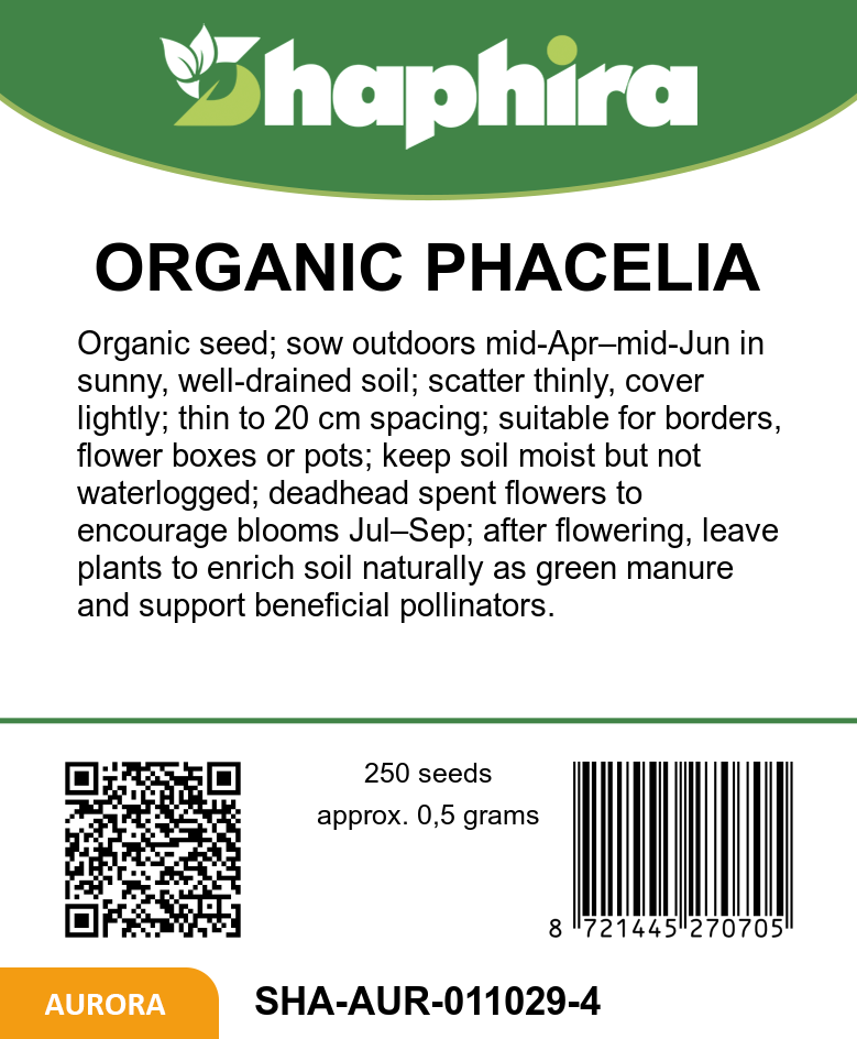 Sow Organic Phacelia Tanacetifolia seeds outdoors from mid-April to mid-June for vibrant blue blooms from July to September. Thin seedlings if needed to allow enough space for growth up to 70 cm tall. This versatile plant thrives in flower boxes, pots, and garden borders, attracting bees and supporting pollinator health. It also enriches soil as a green manure, improving structure and fertility while suppressing weeds. Regular watering and well-drained soil will encourage lush growth and extended flowering. Incorporate phacelia into your garden for a beautiful, eco-friendly way to promote biodiversity and a healthy ecosystem.