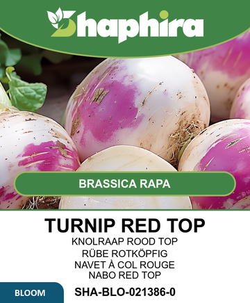 Sow Turnip Seeds Round White Red Top Nancy outdoors from late March to early August in humus-rich, sunny soil with rows spaced 20 cm apart. Thin seedlings to 15 cm for optimal growth. Harvest young turnips for tender, mild-flavored roots perfect for fresh salads or cooking. Avoid planting near cabbages, but potatoes are good companions. Besides their culinary appeal, these turnips serve as excellent green manure, enriching soil fertility and structure. Use them as a follow-up crop to support sustainable gardening and extend your harvest season from May to October.