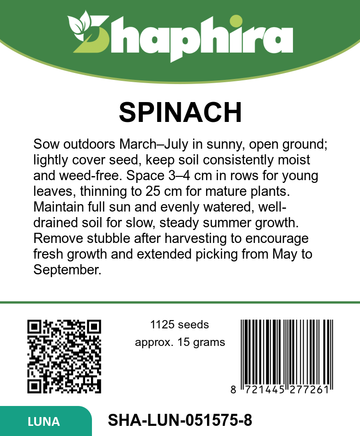 Slow-growing summer spinach seeds, 15g pack, ideal for extended leafy harvests and kitchen gardens.
