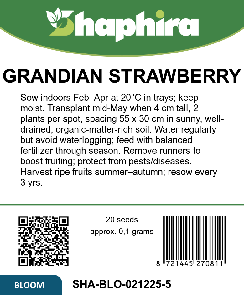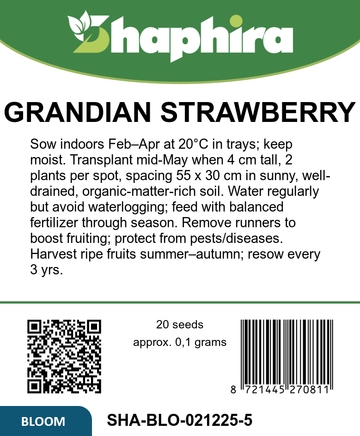 Strawberry seeds Grandian F1 are hybrid strawberry seeds bred for uniform plants, reliable performance, and everbearing strawberry seeds large fruits. Plants are compact yet productive, offering a steady summer autumn strawberry harvest from July into October in suitable conditions. These everbearing strawberry seeds are well suited to both decorative and kitchen gardens, creating a colorful display as the blossoms give way to clusters of glossy red berries. Whether you are starting a new patch or refreshing an existing bed, these everbearing strawberry seeds large fruits are a practical choice for gardeners who value both ornamental appeal and generous yields.