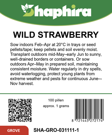 Sow the wild strawberry seeds indoors from February to April at 20Β°C in a seed tray, using seed pellets or tape for precise placement. Keep the pellets moist and water regularly during dry periods to support germination. After seedlings develop, transplant them outdoors from mid-May to early June in a sunny spot with well-draining soil. For outdoor sowing, plant seeds from April to May directly in prepared soil, maintaining consistent moisture. This compact variety thrives well in garden borders or containers, making it ideal for both decorative and fruit-producing purposes.