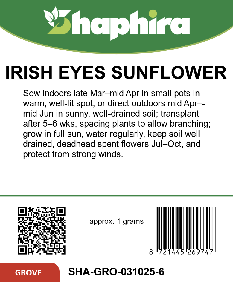 For best results, sow Irish Eyes sunflower seeds indoors from late March to mid-April or directly outdoors between mid-April and mid-June. Transplant seedlings after 5–6 weeks to ensure strong growth. Choose a sunny location, as these sunflowers thrive in full sun and develop vibrant yellow blooms with attractive light green foliage. Their compact height of around 55 cm makes them perfect for borders, large pots, or hedges. Regular watering and well-drained soil will encourage healthy branching and prolonged flowering from July to October, providing beautiful, long-lasting cut flowers for floral arrangements.