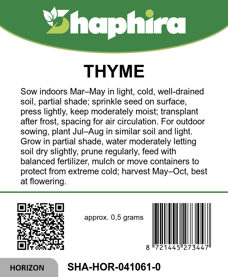 Thyme seeds from the renowned Provence variety offer a compact and flavorful addition to any kitchen garden. This Thymus vulgaris L. cultivar is prized as one of the most popular Mediterranean herbs, widely appreciated for its aromatic qualities and essential role in culinary herbs collections. The Provence thyme seeds produce a more compact herb variety, ideal for gardeners seeking perennial herbs that thrive in light, cold soil and partial shade. The best flavor develops during the flowering stage, making these aromatic plants a valuable choice for enhancing dishes with authentic Mediterranean taste.