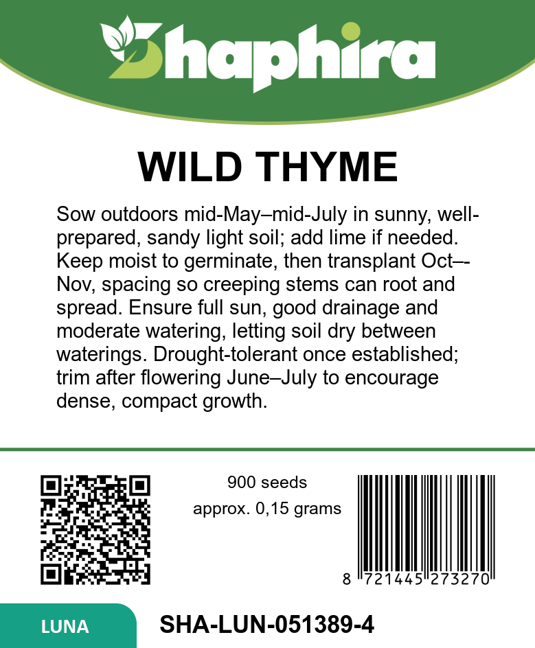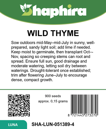 For optimal growth, sow wild thyme seeds outdoors from mid-May to mid-July in a well-drained seedbed, then transplant seedlings in October or November. Choose sandy, light soil and consider adding lime to enhance development. This low-growing perennial thrives in rock gardens and herb gardens, forming dense evergreen carpets about 10 cm tall. Its fragrant purple-red flowers bloom abundantly from June to July, attracting pollinators like bees and butterflies. Regular sunlight and moderate watering support healthy foliage and vibrant blooms, making it a delightful, aromatic addition to natural garden spaces.