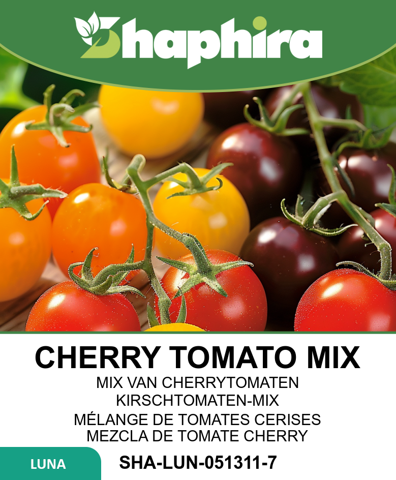 This mix contains four distinct cherry tomato varieties: Sweetie red, Cereza amarilla yellow, Bottondoro orange, and Black Cherry black, each with unique colors and flavors.