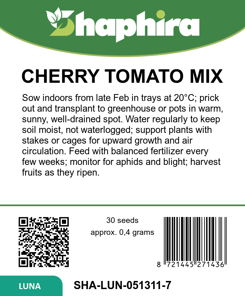 Start sowing these cherry tomato seeds indoors from late February at around 20Β°C for best germination. Once seedlings develop, transplant them into a greenhouse or pots to provide warmth and protection. Each varietyβSweetie red, Cereza amarilla yellow, Bottondoro orange, and Black Cherry blackβthrives with consistent watering and plenty of sunlight. Regularly pinch off side shoots to encourage healthy growth and abundant fruit production. Enjoy the vibrant colors and sweet flavors of this mix, perfect for adding variety to salads or snacking straight from your garden.