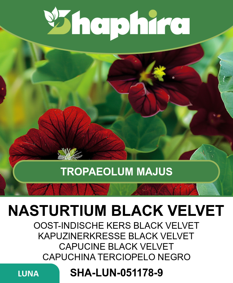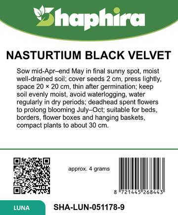 Sow Nasturtium Black Velvet seeds directly outdoors from mid-April to the end of May in a sunny spot with well-moistened soil. Plant seeds about 2 cm deep and space them 20 x 20 cm apart for optimal growth. After germination, thin out excess seedlings to maintain healthy, compact plants. Regular watering supports extended blooming from July to October. This variety thrives in low borders, flower boxes, or hanging baskets, offering striking nearly black flowers and edible leaves that add both beauty and culinary interest to your garden.