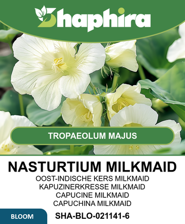 The Nasturtium Milkmaid produces elegant creamy white flowers that bloom from July through October, adding a bright and natural touch to your garden.