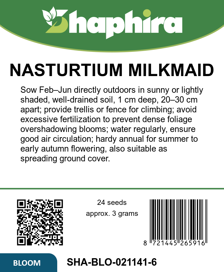 Sow Nasturtium Milkmaid seeds directly outdoors from mid-March to the end of May in a sunny or lightly shaded spot. Prepare well-drained soil and plant seeds about 1 cm deep, spacing them 20-30 cm apart to allow room for growth. Provide support such as a trellis or fence for climbing varieties. Avoid excessive fertilization to prevent dense foliage that may overshadow the creamy white flowers. For best results, sow from February through June, ensuring the delicate plants have enough space and support to showcase their elegant blooms throughout summer and early autumn.