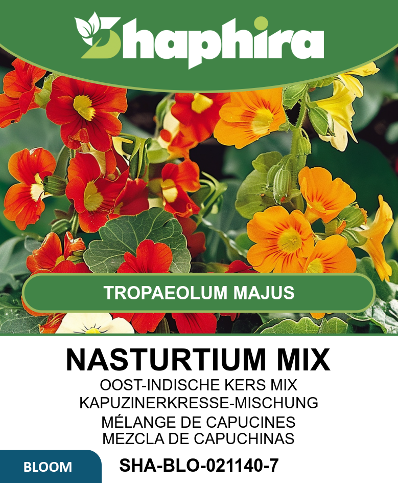 Sow nasturtium seeds directly outdoors from mid-March to the end of May at the desired location. Choose a sunny or lightly shaded spot with well-drained soil. Space seeds about 10-15 cm apart to allow room for climbing or ground cover growth. Plant seeds 1-2 cm deep and water gently. Avoid over-fertilizing, as excessive nutrients encourage dense foliage that can overshadow the vibrant flowers. This mix thrives on minimal care and flourishes beautifully on trellises, fences, or in large pots and hanging baskets, providing colorful blooms from July through September.