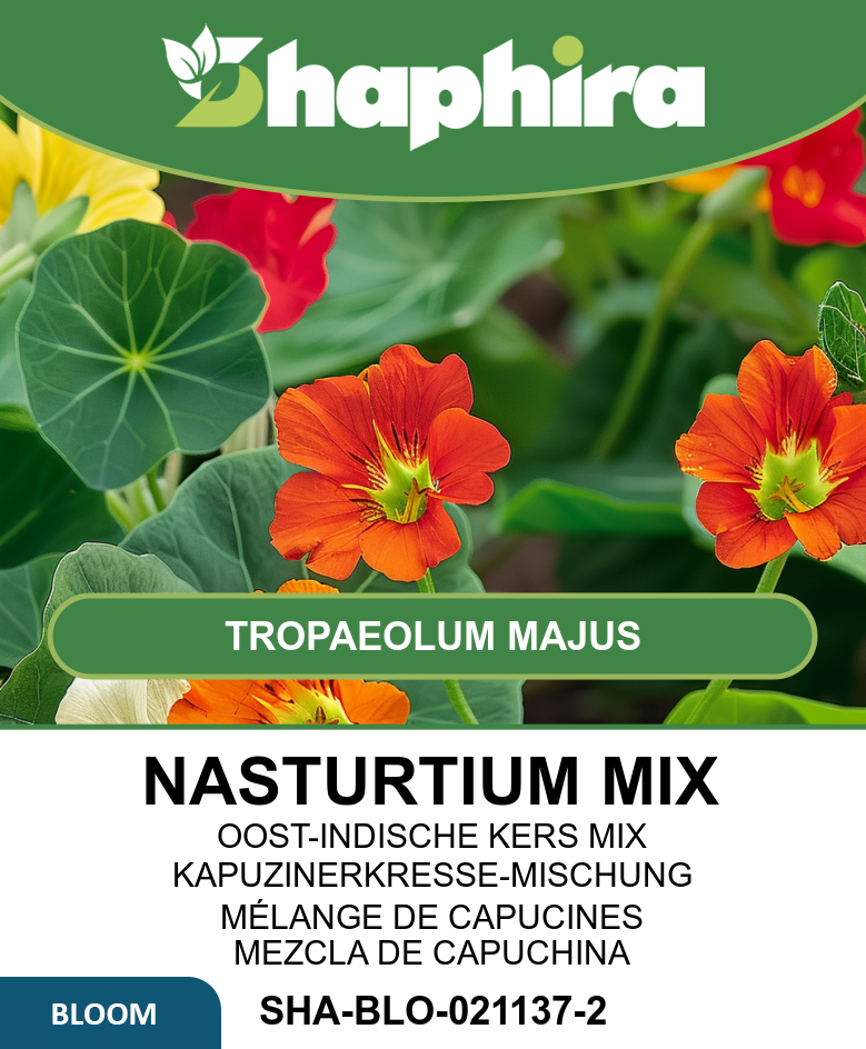 Nasturtium Tom Thumb is a low-growing variety that forms a compact ground cover reaching about 30 cm in height, making it ideal for borders, beds, and large flower boxes.