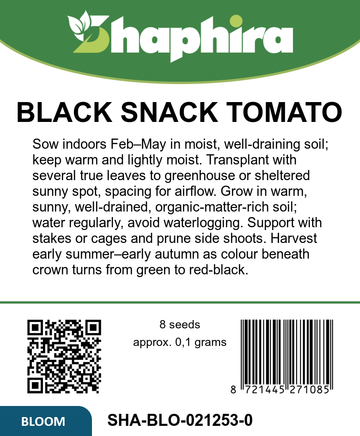 Sow Black Snack Tomato seeds indoors from late February to May in seed trays or small pots filled with moist, well-draining soil. Keep the soil consistently warm and lightly moist until germination occurs. Once seedlings have developed several true leaves and outdoor temperatures are reliably warm, transplant them into a greenhouse or a sheltered, sunny spot. Space plants adequately to allow airflow and growth. Monitor the fruits as they mature and harvest when the color beneath the crown shifts from green to red, revealing their signature dark hue and sweet flavor.