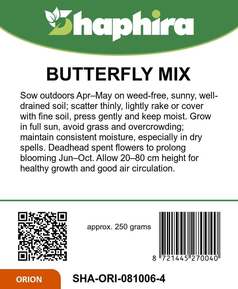 Sow the butterfly flower mix seeds outdoors from April to May on weed-free, sunny soil. Scatter the seeds thinly over the area and lightly rake or cover them with a fine layer of soil. Press the surface gently to ensure good seed-to-soil contact, then keep it moist. Germination happens gradually, so patience is key. This mix thrives in full sun and is perfect for open flower beds. Avoid sowing in grass, and enjoy a colorful floral display from June through October that attracts butterflies and other pollinators.