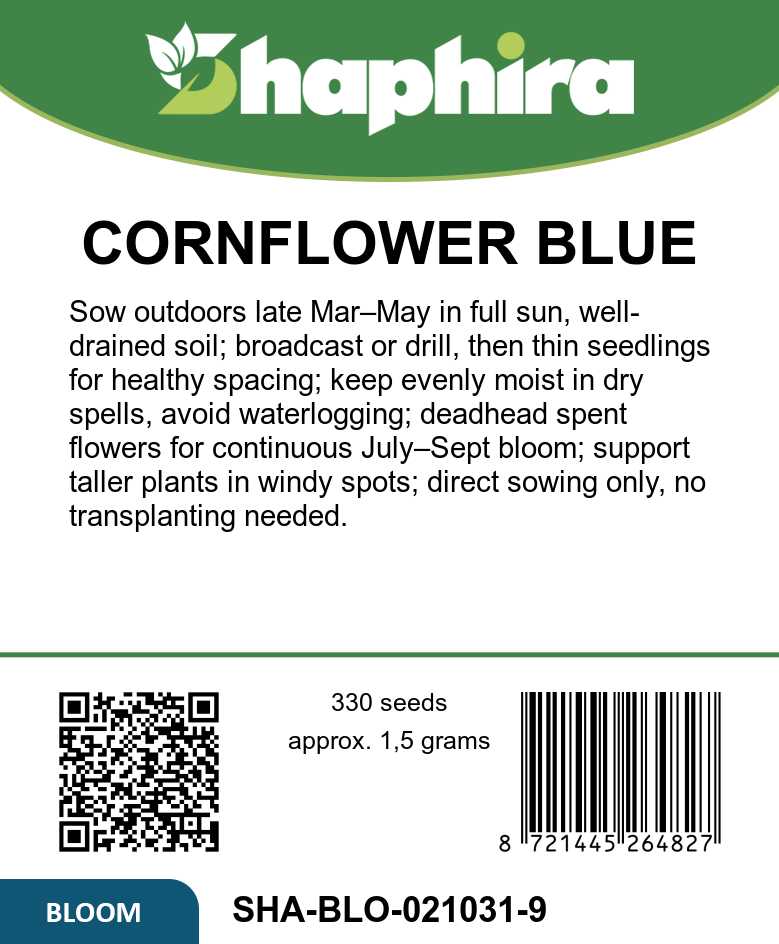Sow Cornflower Blue Ball seeds outdoors from late March to May in a sunny spot for the best growth. Plant them in rows or broadcast the seeds, then thin seedlings to allow space for healthy development. These easy-care annuals reach about 90 cm tall, producing abundant, double-flowered blue blossoms from July to September. Ideal for naturalizing or adding vibrant color to borders, they also make excellent cut flowers that retain their beauty in bouquets. Regular watering and well-drained soil will help ensure a stunning, long-lasting floral display throughout the summer months.