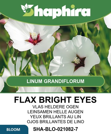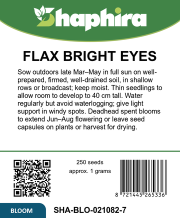 Sow Flax Bright Eyes seeds directly outdoors from late March to late May, either by broadcasting or in neat rows. Ensure the soil is well-prepared and lightly firmed before sowing. After seedlings emerge, thin them slightly to maintain proper spacing and allow each plant room to develop. This annual flax grows to about 40 cm tall, making it ideal for borders. Plant in a sunny location to highlight the ivory white petals with the distinctive chestnut-brown center. Once flowering ends, the seed capsules can be left on the plant for an ornamental touch or harvested for drying.