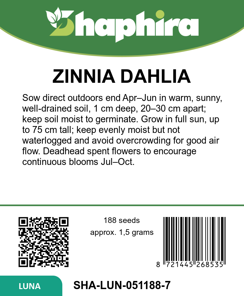 Sow Zinnia Dahlia flower seeds directly outdoors from the end of April to June in a warm, sunny spot with light sun exposure. Plant seeds about 1 cm deep in well-drained soil, spacing them 20-30 cm apart to allow room for their tall growth. Avoid transplanting, as these seeds thrive best when sown at their final location. Keep the soil moist until germination occurs. This method ensures strong plants that will produce large, double blooms resembling dahlias, perfect for adding vibrant color to borders and cut flower arrangements from July through October.