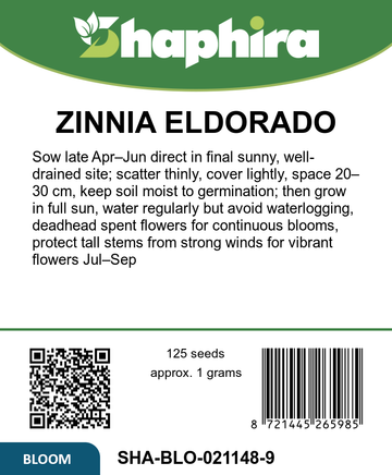 Sow Zinnia Dahlia-flowered Eldorado seeds directly in their final outdoor location between late April and June to avoid transplant shock. Choose a sunny spot with well-drained soil for best growth. Keep the soil consistently moist during germination, and thin seedlings to ensure strong, healthy plants. These vibrant salmon-orange blooms thrive from July to September, offering excellent stems for cutting. Regular deadheading encourages prolonged flowering and a fuller appearance. Their height of up to 75 cm makes them perfect for borders or bouquets, brightening any garden space with minimal care required.