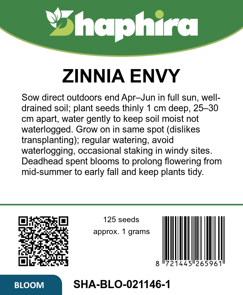 Zinnia Dahlia-flowered Envy thrives in full sun with well-drained soil, producing vibrant lime green blooms from mid-summer to early fall. Support strong stems with occasional staking to keep flowers upright, especially in windy areas. Regular watering encourages steady growth, but avoid waterlogging to prevent root issues. Deadhead spent flowers to promote continuous blooming and maintain a tidy appearance. This variety attracts pollinators, making it a wonderful addition to butterfly and bee-friendly gardens. With its striking color and sturdy nature, it enhances any floral display throughout the growing season.
