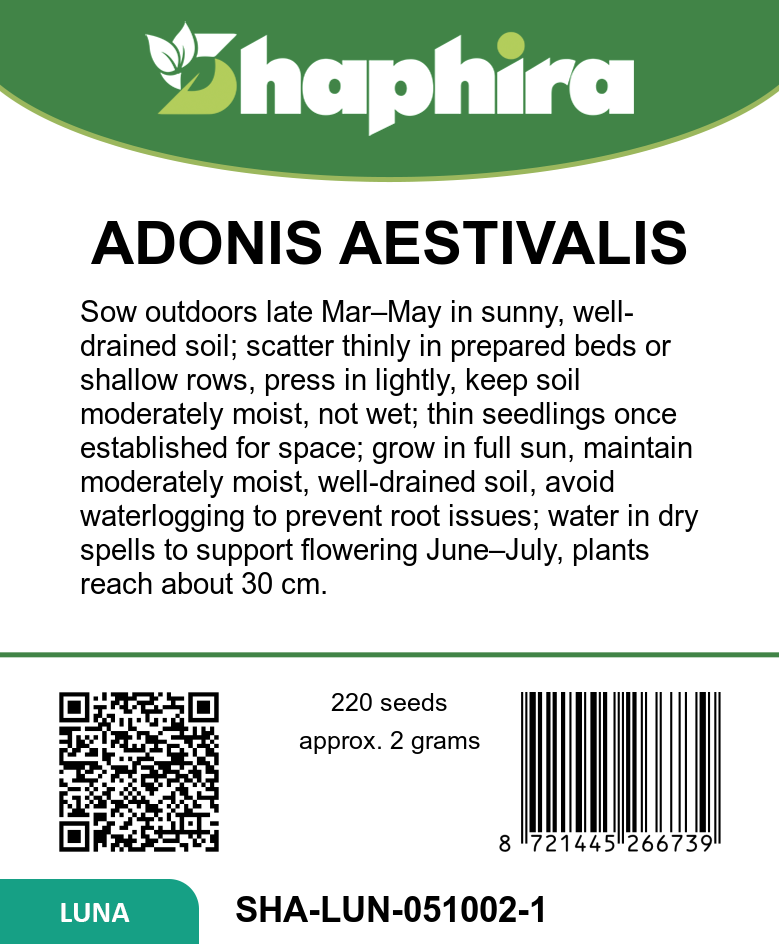 Sow Adonis aestivalis seeds outdoors from late March to late May in a sunny spot with well-drained soil. Scatter seeds thinly in rows or broadcast them across prepared beds, then gently press into the soil without covering too deeply. Keep the soil moderately moist, avoiding excessive wetness to prevent seed rot. Thin seedlings carefully once established to allow sufficient space for growth. This method ensures vibrant red blooms and healthy fern-like foliage, perfect for rock gardens and naturalizing areas. Ideal conditions support the striking display during June and July.