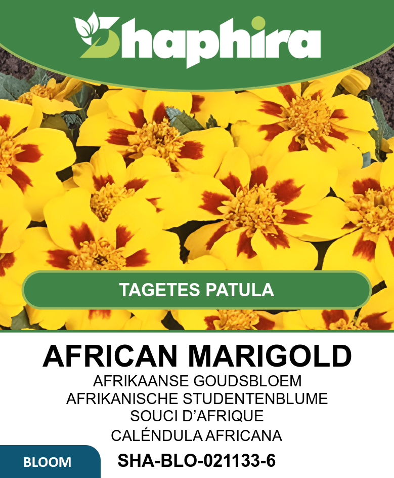 Sow African Marigold seeds indoors from mid-March to April in seed trays or outdoors from mid-April to the end of May directly in seedbeds. Lightly cover the seeds with soil and keep the soil moist. After 5 to 6 weeks, transplant seedlings to their final position, spacing them to allow for compact growth up to 20 cm tall. Choose a location with light sun for optimal development. Transplanting with a root ball is possible once the plants have grown, ensuring minimal disturbance and promoting healthy establishment.