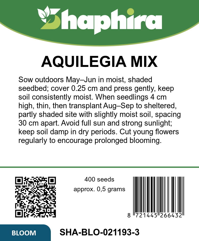 Sow Aquilegia Hybrida Vulgaris Mrs Scott Elliott seeds outdoors from May to June on a moist, shaded seedbed. Cover seeds lightly with 1/4 cm of soil and press gently. Keep the soil consistently moist to encourage germination. Once seedlings reach 4 cm, thin them to provide ample space. In August or September, transplant to a sheltered, partly shaded location with slightly moist soil, spacing plants about 30 cm apart. Avoid full sun exposure and ensure the planting site remains moist during dry periods for optimal establishment and long-lasting growth.