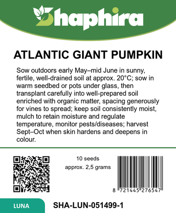 These giant pumpkin seeds for gardening offer a unique opportunity to cultivate a spectacular vegetable prized worldwide. The Atlantic Giant's bright orange flesh is not only delicious but also perfect for autumn decorations and culinary uses. As a climbing pumpkin plant, it requires ample space and moisture to reach its full potential. Gardeners interested in Atlantic Giant pumpkin seeds sowing will appreciate the seed density, with approximately four seeds per gram, ensuring efficient planting. This large pumpkin variety stands out for its remarkable size and vibrant color, making it a favorite among outdoor pumpkin sowing projects tailored for gardeners seeking exceptional results.