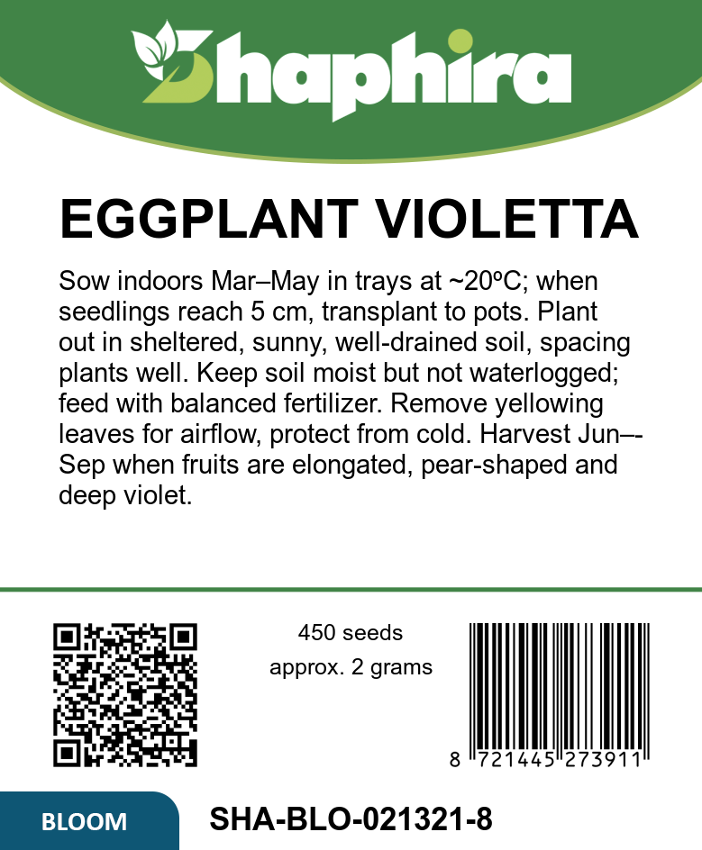 Sow aubergine seeds indoors from March to May in a seed tray at around 20ΒΊC for optimal germination. Once seedlings reach 5 cm, carefully transplant them into individual pots to encourage strong growth. From March onward, sowing under glass outdoors in a sheltered, sunny spot is also suitable. When planting outside, choose a location that protects young plants from wind and offers plenty of sunlight. Allow ample space between plants for healthy development and ensure soil is well-drained to support this striking violet varietyβs growth.