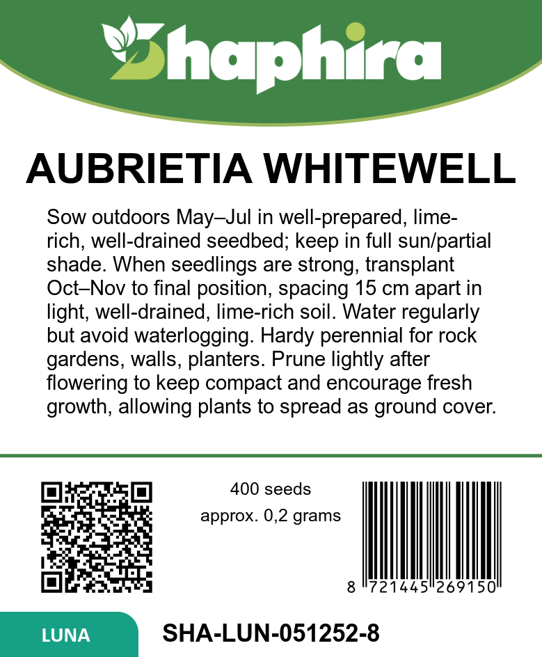 Sow Aubrieta hybrida Whitewell Gem seeds outdoors from May to July in a well-prepared seedbed. Once seedlings are strong enough, transplant them in October or November to their permanent location, spacing plants about 15 cm apart. Choose a lime-rich, well-drained soil to support healthy establishment. This compact plant is ideal for rock gardens, walls, or planters. Ensure the chosen site receives ample light and provides good drainage for best results. Transplanting at the right time helps the plants develop a sturdy root system before winter sets in.