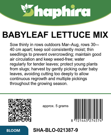Sow babyleaf salad mix seeds thinly in rows outdoors from March to August, spacing rows 30-40 cm apart. Keep the soil consistently moist to encourage healthy germination and growth. Thin seedlings if necessary to prevent overcrowding and allow room for tender leaves to develop. Avoid cutting too deeply during harvest to enable multiple pickings of fresh, colorful leaves. Watch for slugs, which can damage young plants. This mix is ideal for dense sowing, providing a continuous supply of vibrant, soft baby leaves throughout the growing season.