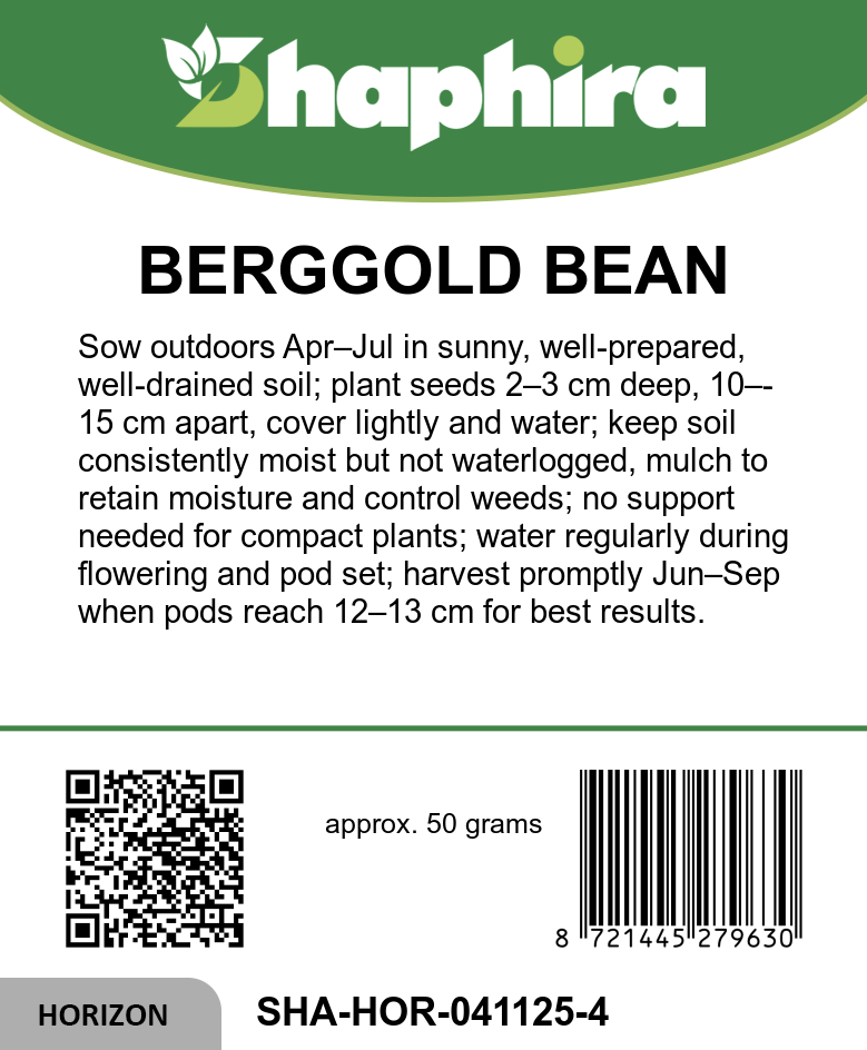 For best results, sow Berggold dwarf bean seeds outdoors from April to July in well-drained soil with full sunlight. Maintain consistent moisture during germination and early growth, avoiding waterlogging to prevent root issues. The compact, low-stem plants are ideal for smaller garden spaces or containers. Harvest pods when they reach 12 to 13 cm long, typically between June and September, to enjoy their sweet, tender flavor. Regular picking encourages continued production, making this variety a reliable and productive choice for a flavorful, homegrown bean harvest.