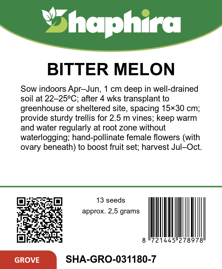 Start sowing bitter melon seeds indoors between April and June at temperatures of 22-25ΒΊC for optimal germination. After about four weeks, seedlings can be transplanted into a greenhouse or protected outdoor environment to shield from colder weather. The plant benefits from sturdy climbing trellises to support its vigorous growth and enhance fruit production. Hand pollinate bitter melon flowers, especially the female blooms identified by the ovary beneath, to maximize fruit set. Regular watering concentrated at the root zone encourages healthy development without over-saturating the soil. Harvest typically begins from July and can continue through October, providing a long season of fresh tropical vegetables for diverse culinary uses.