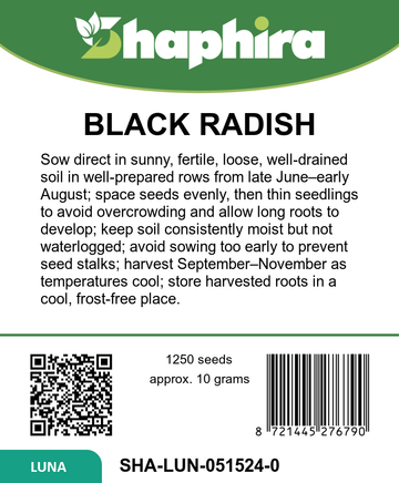 Discover the versatility of black long radish seeds, ideal for gardeners seeking a late season radish variety with a mild spicy flavor. This Raphanus sativus subsp. niger produces long, black roots perfect for outdoor radish sowing from June through August. Known for its resistance to bolting, this winter radish variety thrives when sown later in the season, ensuring robust growth and flavorful harvests. The spicy black radish seeds yield crisp roots that are excellent for fresh salads or adding a piquant touch to various culinary dishes.
