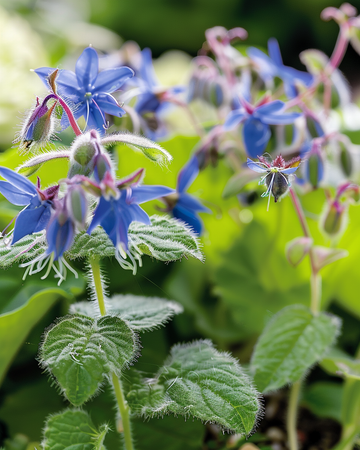 Compact blue borage, cucumber-scented herb with starry flowers for salads and edible garnishes.