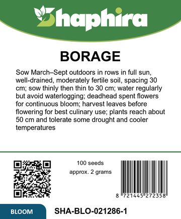 Sow these blue borage flower seeds from March to August outdoors or from March to June indoors to enjoy a long season of harvest from June through October. The tender young leaves and pretty, edible blooms make borage for salads and garnishes a favourite in many kitchens. Use these borage seeds for salads to complement cucumber and potato salads, or to decorate cold dishes with their vivid blue flowers. As versatile annual herb garden seeds and mediterranean herb seeds, they are well suited to outdoor beds, raised planters and cottage-style borders, where plants will flourish, flower, set edible flower seeds and naturally complete their life cycle after seed formation.