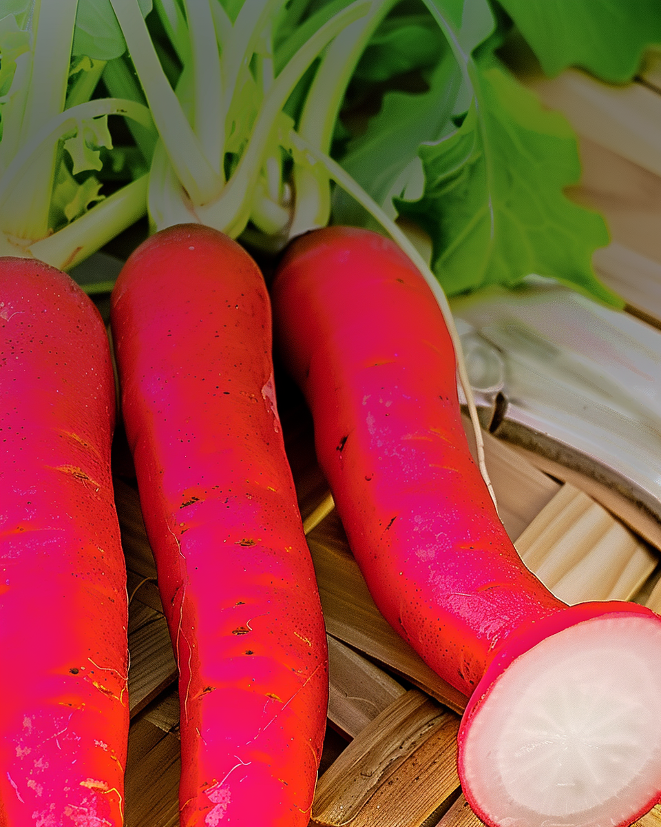 Vibrant Italian radishes with long red roots
