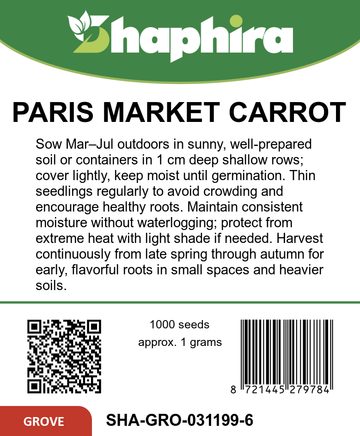 Sow Carrot Paris Market seeds outdoors from March to July in well-prepared, sunny soil. Create shallow rows about 1 cm deep and space seeds evenly to allow room for growth. After sowing, gently cover with soil and keep the area moist until germination. If needed, thin seedlings to avoid overcrowding and encourage healthy root development. This variety adapts well to heavier soils and is perfect for containers, pots, or garden beds. Planting in a sunny spot ensures the best results and supports an early, flavorful harvest from May through October.