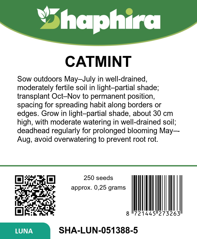 Sow catmint seeds outdoors from May to July in a prepared seedbed, ensuring the soil is well-drained and moderately fertile. Once seedlings develop, transplant them in October or November to their permanent location, spacing plants to allow room for their spreading habit. Choose a light to partially shaded spot to promote healthy growth. This perennial herb thrives when planted along borders or edges, where it forms attractive clusters. Its aromatic foliage and delicate blue flowers will naturally invite butterflies and bees, enhancing garden biodiversity and charm.