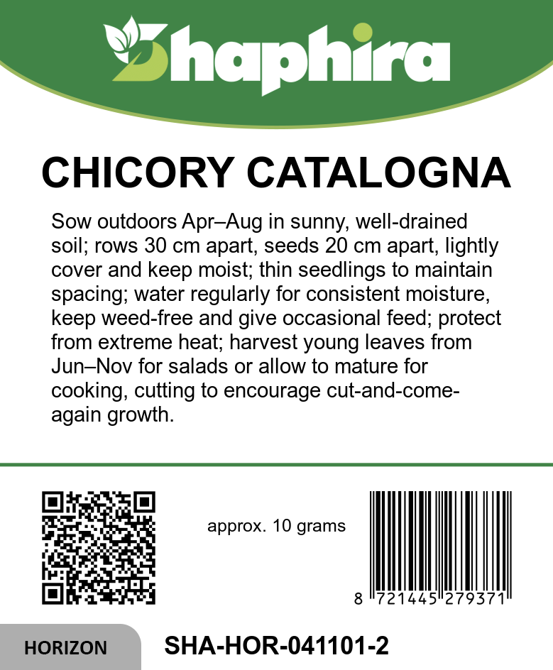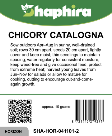 Chicory Catalogna Pugliese thrives in sunny, well-drained soil with regular watering to maintain consistent moisture. Its upright growth and cut-and-come-again habit allow for multiple harvests throughout the growing season. Providing space between plants encourages healthy leaf development and air circulation. Protect from extreme heat to preserve leaf tenderness and flavor. Harvest young leaves for a spicy addition to salads or allow leaves to mature for cooking. This versatile chicory performs best when kept weed-free and receives occasional feeding to support vigorous growth and rich, slightly bitter leaves.