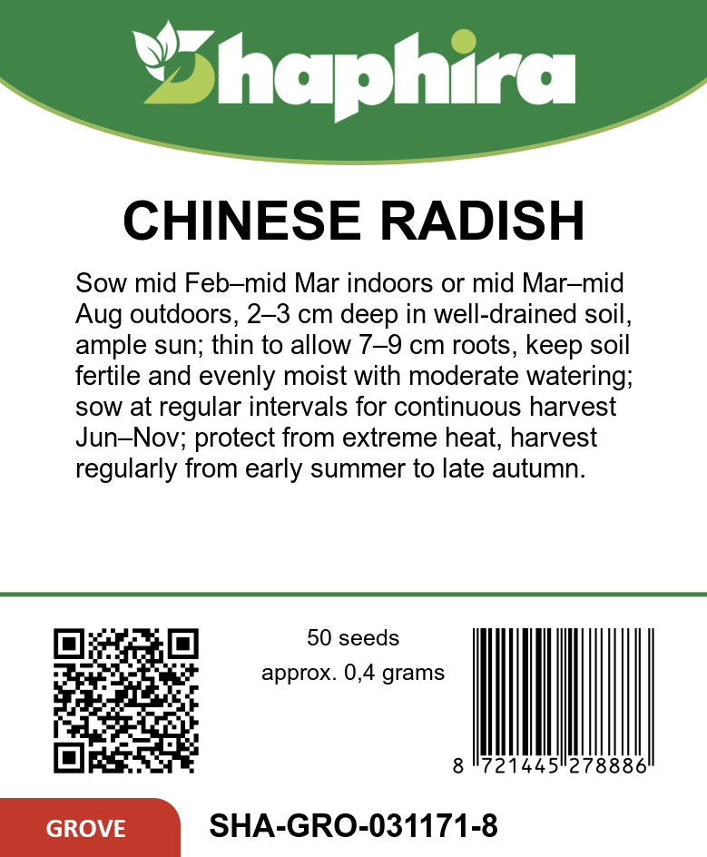 Chinese Radish Red Impression thrives in well-drained, fertile soil with consistent moisture to ensure crisp, juicy roots. Maintain moderate watering to avoid splitting and provide partial to full sunlight for optimal growth. Thin plants adequately to allow 7β9 cm radishes to develop fully, encouraging crunchy texture and vibrant color inside. Regular harvesting supports continuous production from early summer to late autumn. Protect from extreme heat to preserve mild peppery flavor and tender crunch. This variety adapts well to successive growing cycles, making it an excellent choice for fresh, colorful additions to your garden throughout the growing season.