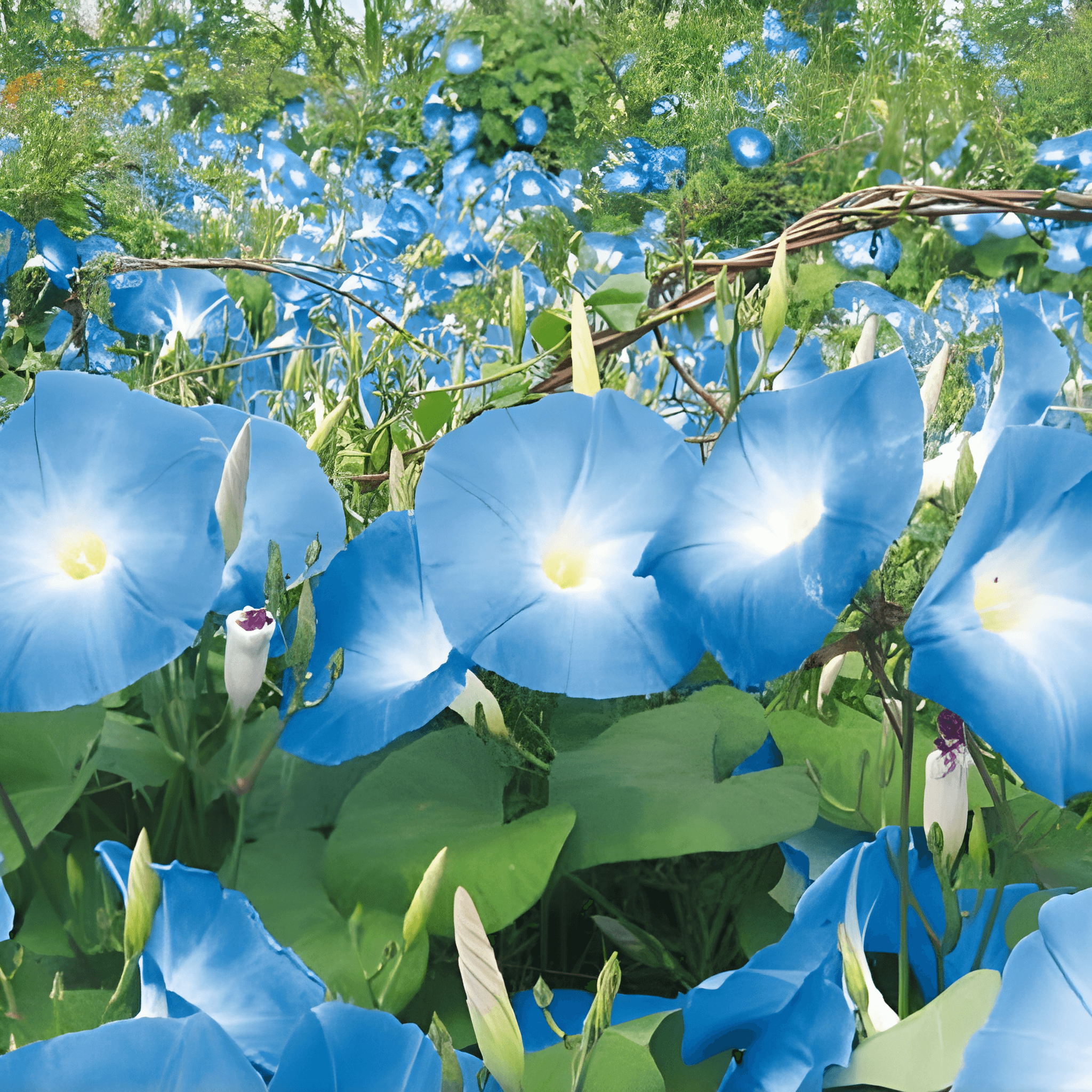 Climbing Morning Glory thrives in full sun, needing support such as fences, walls, or pergolas to showcase its vibrant blue trumpet-shaped flowers. Regular watering encourages healthy growth, but avoid waterlogging. Fertilize moderately during the growing season to boost blooming. This fast-growing vine can reach up to 3 meters, creating beautiful vertical interest. Deadheading spent flowers helps prolong blooming from mid-summer to early autumn. Protect from strong winds to prevent damage and enjoy a stunning display that attracts pollinators and enlivens garden spaces with minimal maintenance.