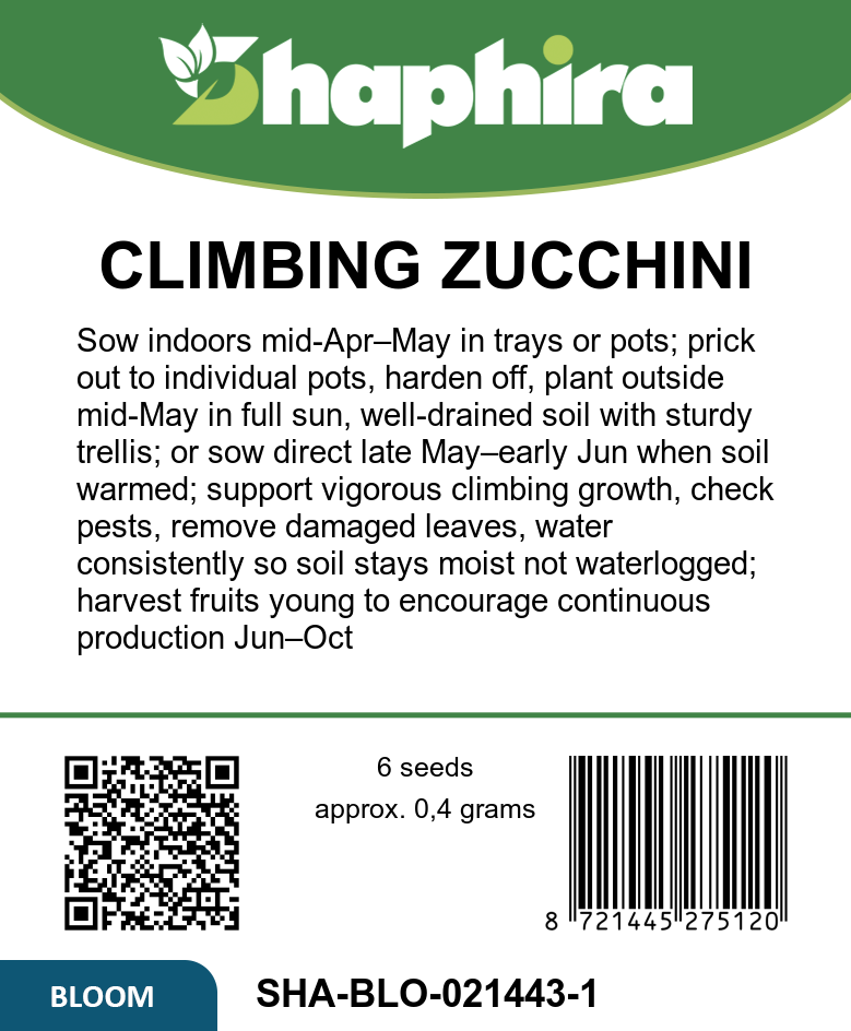 Sow Climbing Zucchini Black Forest F1 indoors from mid-April to May for an early start, then transplant outside in mid-May or sow directly outdoors when the soil warms. Provide a sturdy trellis or support to encourage vertical growth, which improves air circulation and reduces disease risks. Harvest fruits young, from June through October, to enjoy tender, flavorful courgettes with a long shelf life. This compact climber is perfect for small gardens or containers, thriving both in greenhouses and sunny outdoor spots during warm summers.