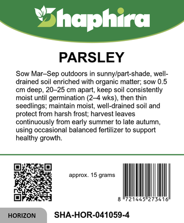 This garden parsley variety offers a long harvesting period, allowing for fresh cuts from early summer through late autumn. Sowing outdoors from March to September ensures a continuous supply of this aromatic herb throughout the growing season. The extended harvest window makes this long harvesting common parsley ideal for those wanting a steady source of garden-fresh seasoning herb. Whether used as a salad ingredient or to enhance culinary creations, this Petroselinum crispum variety stands out as a classic and essential addition to any herb garden.