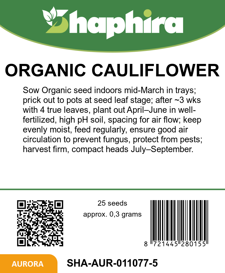 For optimal growth, sow these organic cauliflower seeds indoors in mid-March and transplant once seedlings show true leaves. Ensure soil is well-fertilized with a high pH to support vigorous development. Plant outdoors between April and June, spacing plants to allow airflow and reduce disease risk. The upright dark leaves naturally protect developing heads, but regular watering and consistent moisture will encourage compact, white curds. Harvest from July to September for the best flavor and texture. This variety thrives in warm seasons, making it ideal for summer and autumn vegetable gardens.