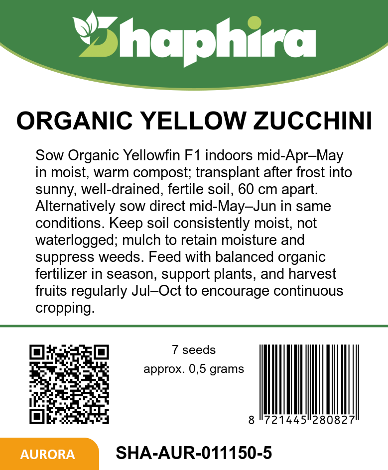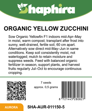 Sow organic courgette Yellowfin F1 seeds indoors from mid-April to May in seed trays or small pots. Keep the soil moist and warm to encourage germination. After the danger of frost has passed, typically after the ice saints, transplant seedlings outdoors into well-drained, fertile soil spaced about 60 cm apart. Alternatively, sow seeds directly outdoors from mid-May to June once temperatures are consistently warm. Choose a sunny location for planting to support strong, sturdy plants that will produce vibrant yellow fruits throughout the summer and early autumn months.